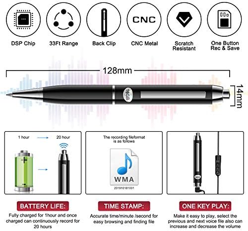 ✔Massive Card Storage However Transportable: The 16GB storage means that you can retailer greater than 190 hours of recorded information and 5,000 songs. The design of the clip is handy so that you can put on in your coat or ebook. Not solely that, ballpoint Pen design and 6 FREE-GIFT pen refillers permit you to take notes whereas recording and take it to in all places for very long time use conveniently. Additionally it is a small, light-weight with wearable clip so you possibly can take it with you. All these make it an excellent sensible and nice reward for