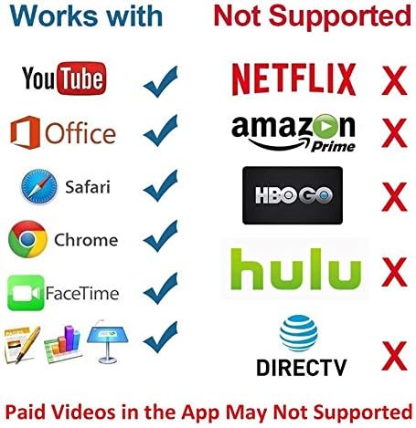 3.This adapter cable can assist to reflect YouTube/ Workplace/ Safari/ Chrome/ FaceTime, Whereas NOT assist NETFLIX / Amazon Video/ DIRECTV/ hulu. And the entire paid movies within the app couldn’t assist to reflect
