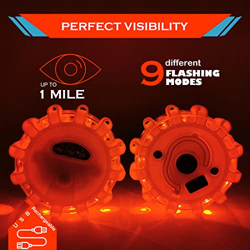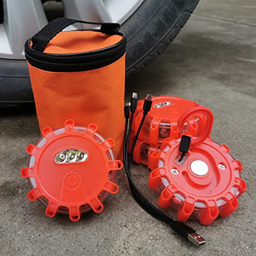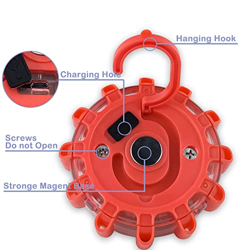 4 Pack Rechargeable LED Highway Flares Roadside Emergency Automotive Package, Emergency Lights for Autos with Magnetic Base & Hook, 3 in 1 USB Cable Included