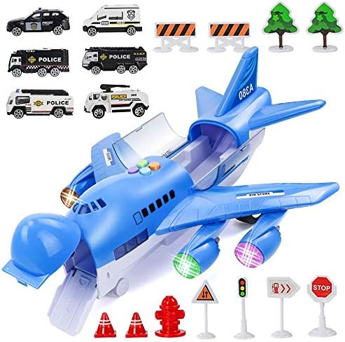 TRANSPORT CARGO AIRPLANE-✈️ Airplane toy set,6 Completely different police vehicles, 11 street indicators and a play mat,in order that youngsters extra actually perceive the data of site visitors and the that means of the street indicators by way of the sport.