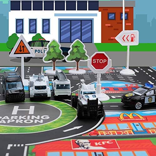 Automobile Toys Set with Transport Cargo Airplane and Giant Play Mat, Mini Instructional Car Police Automobile Airplane Toy for Youngsters Toddlers Boys Little one Present for 3 Years Previous, 6 Automobiles, Giant Aircraft, 11 Street Indicators