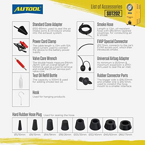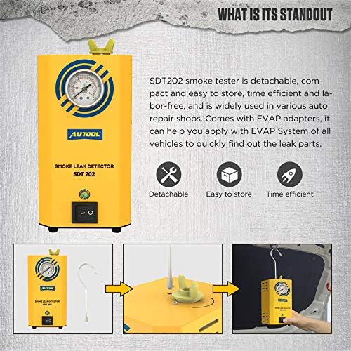 SDT202 smoke tester is removable, com-pact and simple to retailer, time environment friendly and la-bor-free, and is broadly utilized in varied autorepair retailers. Comes with EVAP adapters. itcan provide help to apply with EVAP System of allvehicles to rapidly discover out the leak elements.