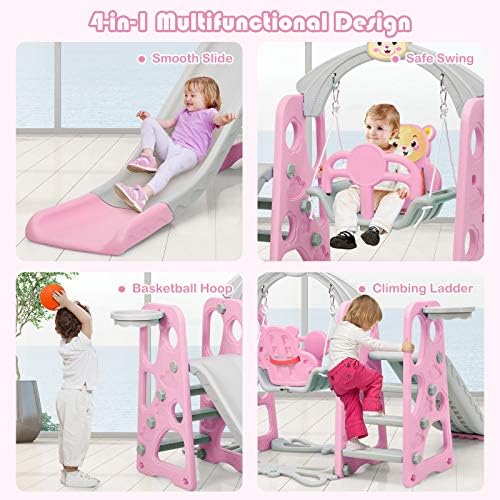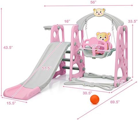 Costzon 4 in 1 Toddler Swing and Slide Set, Youngsters Play Climber Slide Playset with Security Belt, Basketball Hoop, Further Lengthy Slide and Ball, Child Swing Set for Indoor Outside Yard (Pink Bear)