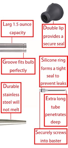 SUCTION: Squeeze the bulb head, , Turkey Baster creates highly effective suction.are capable of effortlessly acquire sizzling pan liquids,launch bulb head ,Pour out and redistribute them throughout your meats,