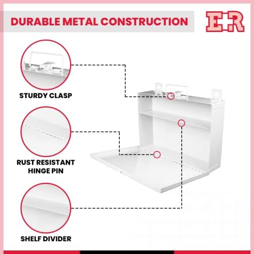 The sturdy metallic physique consists of a rust-resistant hinge pin, sturdy clasp, shelf divider, a carrying deal with, and hangers for wall mounting. The metallic has a white powder coating end.
