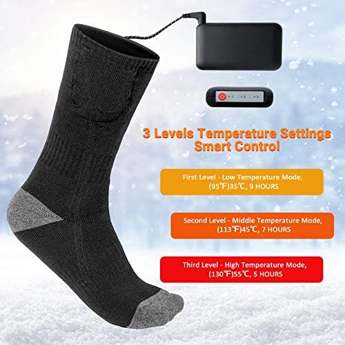 2020 UPGRADED INSTANT HEAT: Rechargeable heated socks are geared up with two 4800mAh Massive Capability Battery, offering you with as much as 16 hours enduring heat. 3 HEAT SETTINGS: together with excessive warmth(155-160℉, 8.5-9 hours), medium warmth(140-150℉, 12-12.5 hours), and low warmth(115-120℉, 15-16 hours). Electrical heated socks excellent for maintaining your ft heat in winter.