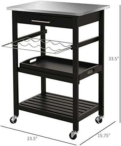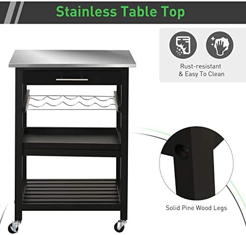 HOMCOM Pine 3-Tier Multifunction Rolling Kitchen Island Cart with Open Storage Cabinets, Wine Rack & Stainless Metal Prime