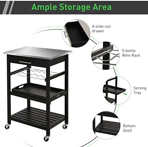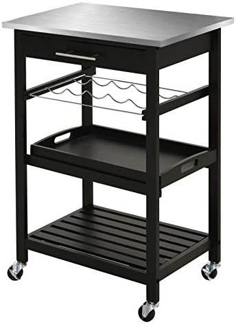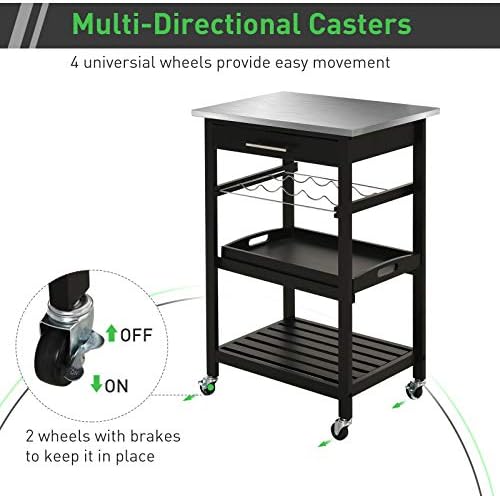 Constructed of sturdy stainless-steel tabletop and high-quality pine, it’s constructed for longevityEquipped with a drawer and a stainless-steel 5- bottle wine rack, further space for storing is availableAn independ serving tray to added convienceUniversal wheels with brake gadgets stop an accident from taking placeThe whole bearing capability is 110 lbsThis kitchen cart could be rolled to wherever it is wanted whereas maintaining your kitchen area and counter clear and clutter-freeEasy meeting is required