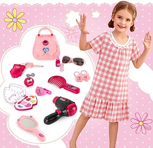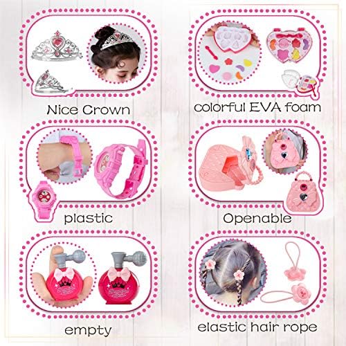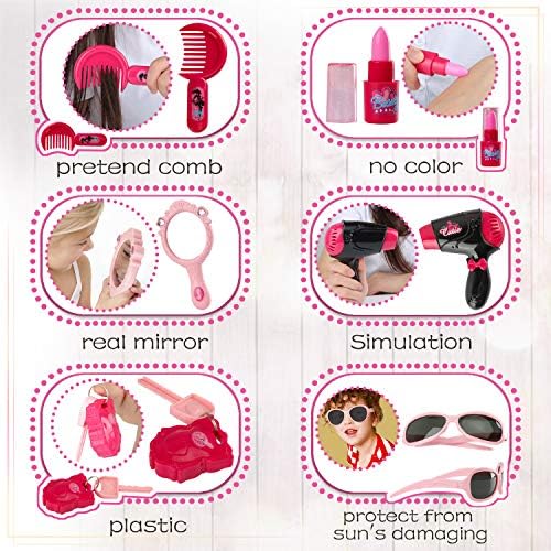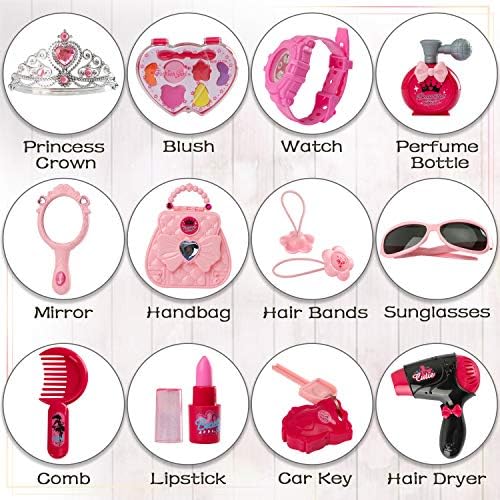 👛Bundle Included: 1x Princess Crown, 1x Purse, 1x Watch, 1x Automobile Key, 2x hair bands, 1x Fragrance, 1x Lipstick, 1x Blush, 1x Hair Dryer, 1x Sun shades, 1x Mirror, 1x comb. Your little lady can benefit from the position play recreation.