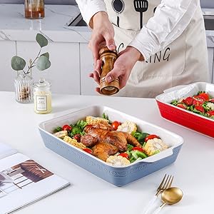 【LONG LASTING COLOR AND SCRATCH RESISTANT】: This baking dish is made of top quality and Eco-friendly glaze, completely LEAD-FREE and NON-TOXIC. Extraordinarily arduous glaze doesn’t scratch and sturdy for on a regular basis use, splendid within the kitchen for making scrumptious meals and desserts.