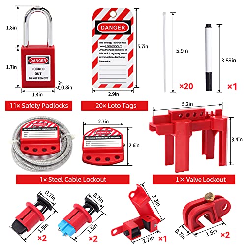 1.Lockout tagout station consists of 11 lockout tagout locks keyed totally different,20 lockout tags,2 lockout hasps,9 various kinds of common circuit breaker lockout,1 metal cable lockout ,2 valve lockout ,1 ball valve lockout,2 electrical plug Lockout,20 nylon cable tie,1 pen,1 metal loto station.
