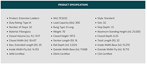 Dimensions – Extension Ladder Most Peak (ft.): 29 | Storage Depth (in.): 6.5 | Storage Peak (ft.): 32 | Product Weight: 62 lb