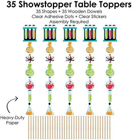 Scientist Lab Showstopper Desk Toppers INCLUDE: 35 heavy-duty paper centerpiece cut-outs in our science theme. Every cut-out form is printed double-sided and contains 35 wood dowel sticks. DIY meeting is required.