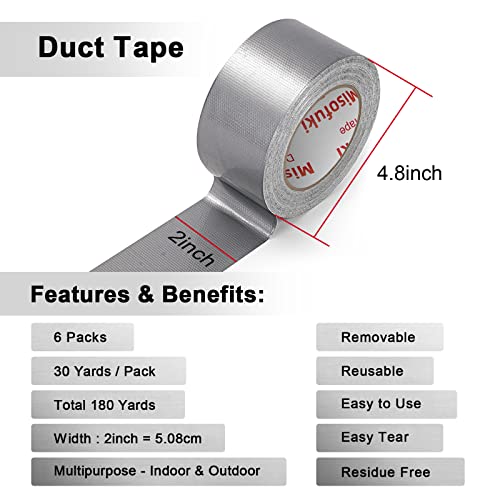 Misofuki Duct Tape Heavy Responsibility Waterproof 2″ x 30 Yards, 6 Roll Multi Pack, Sturdy, Versatile, No Residue, All-Climate, Simple to Tear by Hand, Multipack Worth for Restore, Industrial, Skilled Use