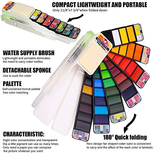 High quality watercolor brushes: 3 Extremely sturdy brushes, 2 spherical tip brushes and 1 flat tip brush, simple to squeeze barrel for optimum management of water circulation. From the smallest particulars to the biggest coat purposes, each stroke will come to life. Area saving foldable watercolor paint set maintain is straightforward for pigment show and collapses for straightforward storage. There are colour charts on the backside of every layer, simpler for you selecting colours.