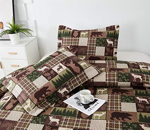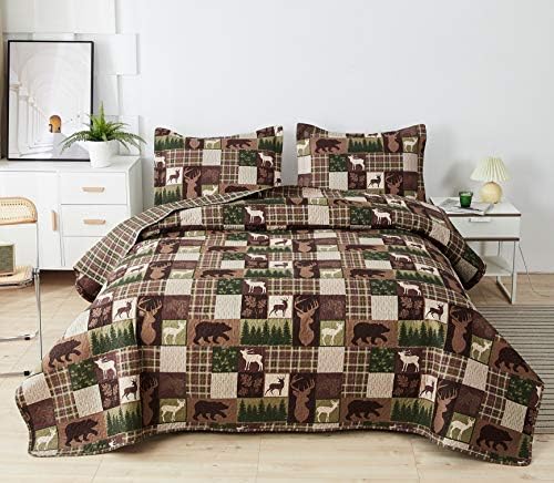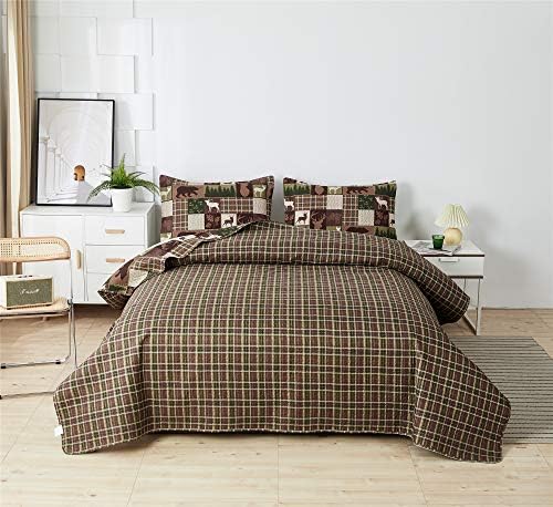 Moose Lodge Light-weight Quilt Set Queen(90X 90in.) Plaid Bear Deer Timber Heat Season Quilted Bedspread Coverlet Bedding Set,Rustic Cabin Reversible Summer time Comforter Blanket,Mattress Cowl (Queen,Brown)