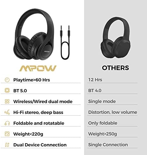 Mpow 059 Lite Bluetooth Headphones, 60 Hours Playtime Wi-fi Headphones Over Ear with Microphone, Bluetooth 5.0, HiFi Stereo Sound, Protein Earpads, Wired Wi-fi Headset for Children, Adults, TV