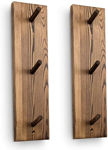 Set of two wall mounted 3-hook wooden mug hanging racks with rustic burnt end