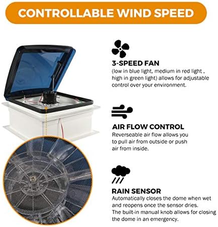 【2 WAY 3 SPEED FAN】- The highly effective but compact RV vent fan with 10 clear blades has variable speeds by guide to get the airflow exactly as you need. 3-speed fan (low in blue mild, medium in pink mild , excessive in inexperienced mild). Reverseable air stream permits you to pull air from outdoors or push air from inside.
