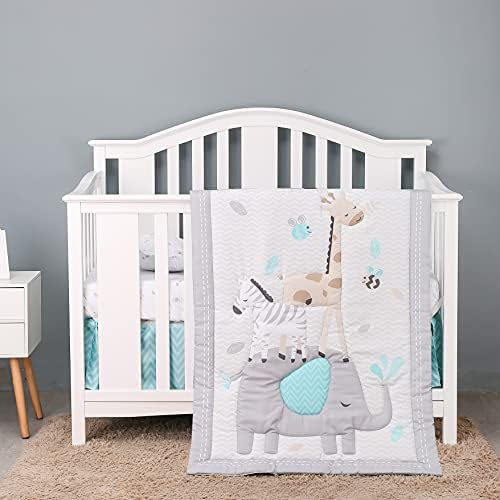 PINNKKU Child Elephant Decor 3- Piece Crib Bedding Set, Crib Bedding Units for Boys, Brilliant Blue and Gray,Safari Nursery Decor, Comforter, Skirt, Crib Sheet