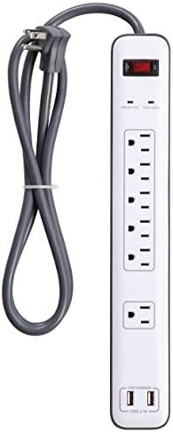6-Oultet, White, 1800J Surge Strip, 4FT Twine, Proper Angle Plug, 2-Port USB Charger, 1 Transformer Outlet.