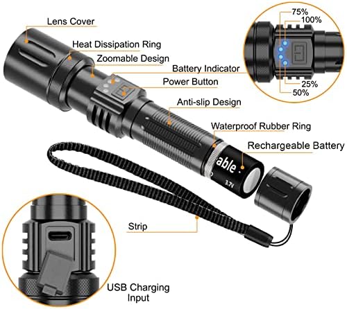 【USB TYPE-C Rechargeable】LED flashlight makes use of 3000mAh rechargeable battery. Utilizing Sort-c charging know-how, 20% quicker than conventional charging. Energy provide from laptop computer, automobile charger, energy financial institution, and many others. will be charged. Flashlight battery indicator: 100%-75%-75%-50%-25%, it reveals how a lot vitality you need to use.
