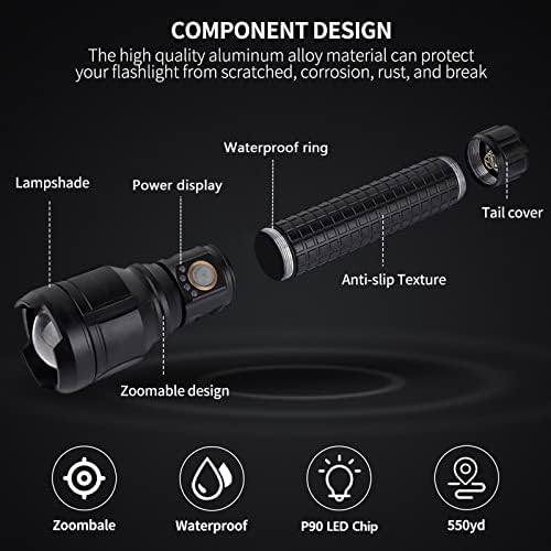 Rechargeable LED Flashlight, 150000 Excessive Lumens Tremendous Vibrant Highly effective Flash Lights, LBE Handheld Massive Tactical Flashlight Out of doors with Zoomable, 3 Modes, IPX7 Waterproof (Black)
