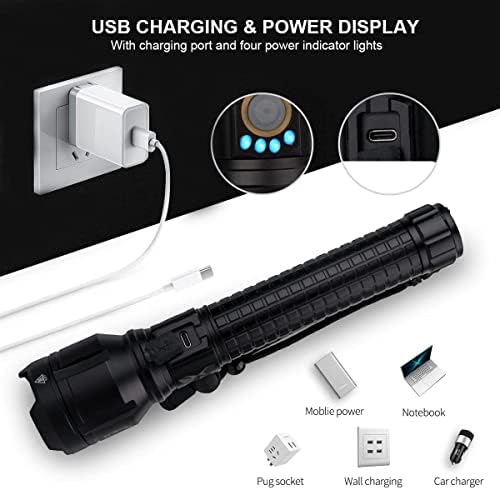 🔦【Rechargeable Flashlight】The benefit of excessive lumen flashlight’s USB is that the charging pace is quicker, the charging port will not be straightforward to put on and extra sturdy. This led flashlight with USB direct charging via energy financial institution, good cellphone adapter, laptop(laptop computer), automobile or charging plug with out disassembling the sunshine; 4 energy indicators on the flashlight displaying the ability consumption.