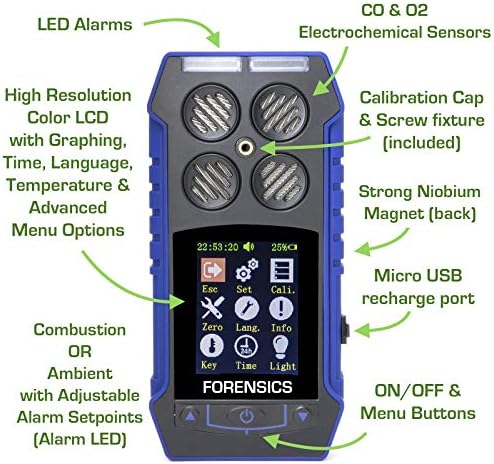 Residential Combustion Analyzer by Forensics | Flue Gasoline Analyzer | CO, O2, COAF & EA | Water Lure, Particle & NOx Filters | Shade Show, Graphing, Information Logging | USA NIST Calibration |