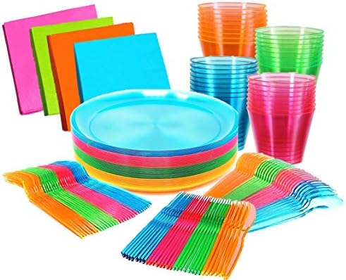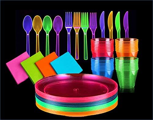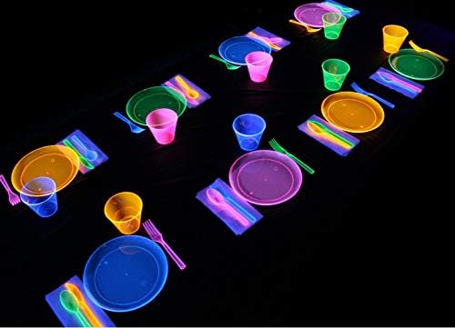Shiny Neon Celebration Provides Set – Serves 32 Visitor, Contains Plates, Cups Tumblers 9 Oz, Cutlery, Forks Knifes and Spoons and Napkins, 32 Of Every. Glow Within the Darkish Celebration Blacklight UV Events.