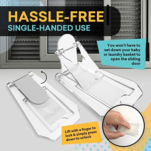 Sliding Door Lock Little one Security – Closets, Home windows, Patio, Glass Doorways – Double Sided Tape, Straightforward Set up No Drill Required, 4 Pack, Clear