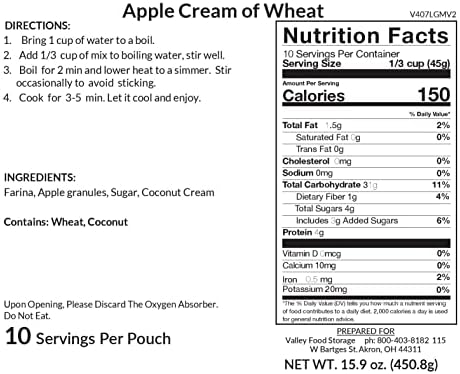Valley Meals Storage Apple Creamy Wheat Farina Sizzling Cereal | Premium Emergency Meals Provide | Non-GMO Survival Meals 25 Yr Shelf Life | Tenting Meals, Backpacking Meals, Prepper Provides