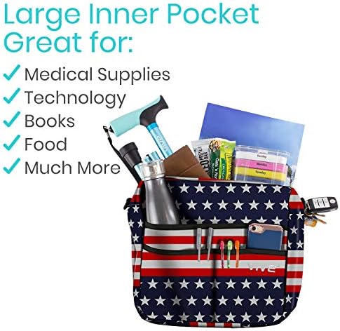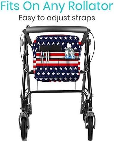 PLENTY OF STORAGE: Supplies three hands-free storage compartments; two separate entrance storage pockets and one giant compartment on prime with velcro flap. Can be utilized on the again of wheelchairs, rollators, and transport chairs.