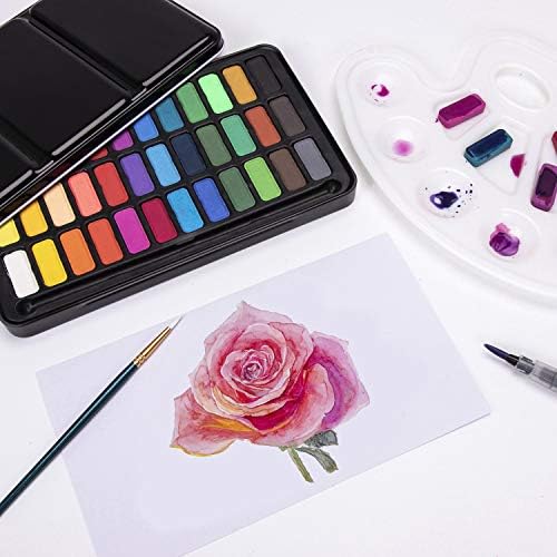 Watercolor Paint Set, 36 Colours with 3pcs Water Brush Pens, 1pc Nylon Paint Brush, 8 Sheets 300g Watercolor Paper, Light-weight and Transportable for Youngsters, Adults, Artists, Newcomers